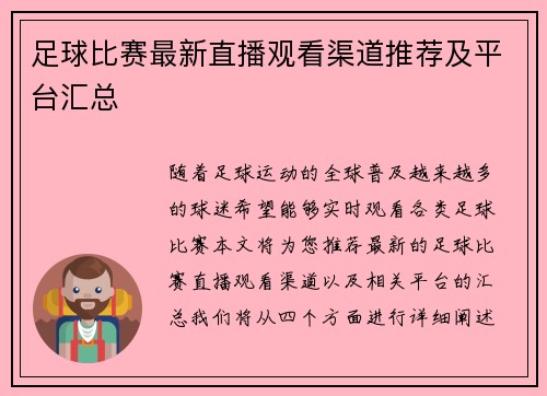 在如今信息技术飞速发展的时代,足球比赛的直播方式也变得多样化。其中,爱奇艺作为国内知名的视频平台之一,凭借其丰富的内容和优质的服务,已经成为众多球迷观看足球比赛的重要选择。本文将围绕“爱奇艺直播足球比赛观看指南及相关平台推荐”这一主题进行详细探讨。首先,我们将介绍如何在爱奇艺上找到并观看足球比赛,包...